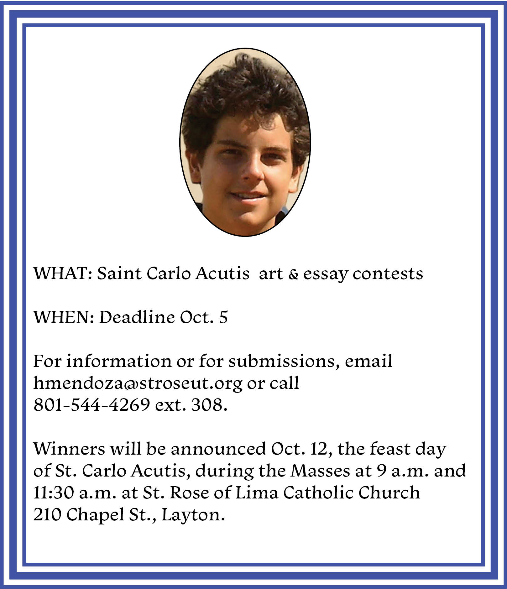 Winners will be announced Oct. 12, the feast day of St. Carlo Acutis, during the Masses at 9 a.m. and 11:30 a.m. at St. Rose of Lima Catholic Church, 210 Chapel St., Layton. After the Masses, those attending will be invited to the parish social center to learn more about the saint.