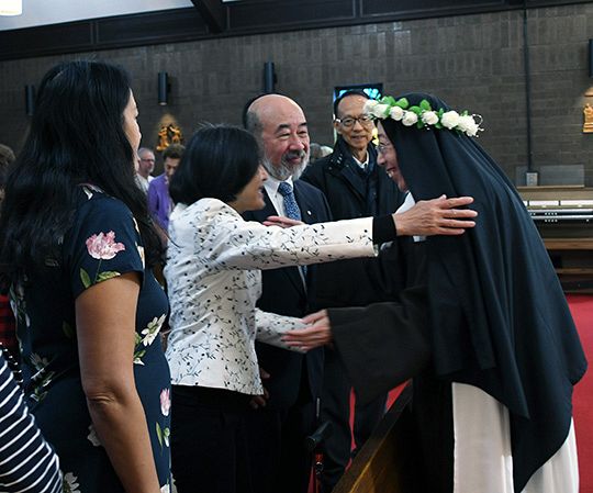 Carmelite Sister Mary Genevieve of St. John greets her family at the Sign of Peace during the Mass at which she professed solemn vows.