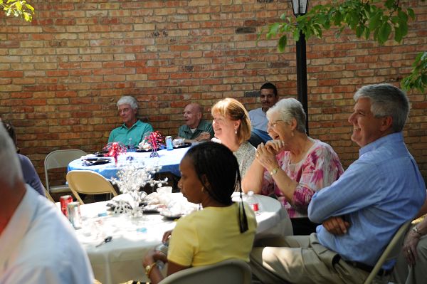 During a barbecue on Aug. 19, the Diocese of Salt Lake City Pastoral Center celebrated the 80th birthday of Monsignor J. Terrence Fitzgerald, vicar general emeritus (far left), and the 60th anniversary of religious profession for Holy Cross Sister Genevra Rolf, retired assistant superintendent of Utah Catholic Schools (far right).
