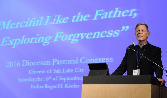 Father Roger Keeler gives the keynote address in English at the 2016 Diocese of Salt Lake City Pastoral Congress; he focused on the theme of forgiveness.