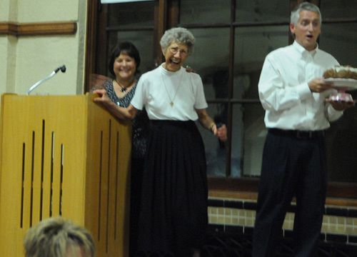Benedictine Sister Stephanie Mongeon and Craig Bielik react to the bid of $100 for Sr. Stephanie’s pumpkin cake during the live auction at the sixth annual Funds of Love fundraiser for the St. Benedict’s Foundation on Sept. 28 in Ogden’s Union Station. Bielik served as auctioneer for the event. Behind Sr. Stephanie is Yvonne Ulloa Coiner, executive director of St. Benedict’s Foundation.