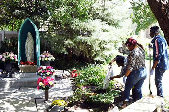 Sylvie Minche, along with her sister and nephew, plant flowers in the Marian grotto at St. Thomas More Parish in Cottonwood Heights on Aug. 15, the Solemnity of the Assumption of Mary. Minche is a member of the parish’s rosary ministry.