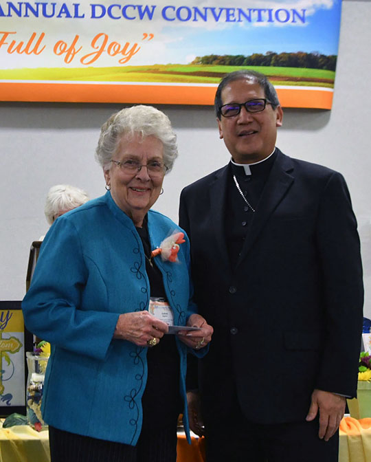 JoAnn Seghini is shown receiving the 2018 Diocesan Council of Catholic Women Woman of the Year for St. Therese of the Child Jesus Parish from Bishop Oscar A. Solis. IC file photo
