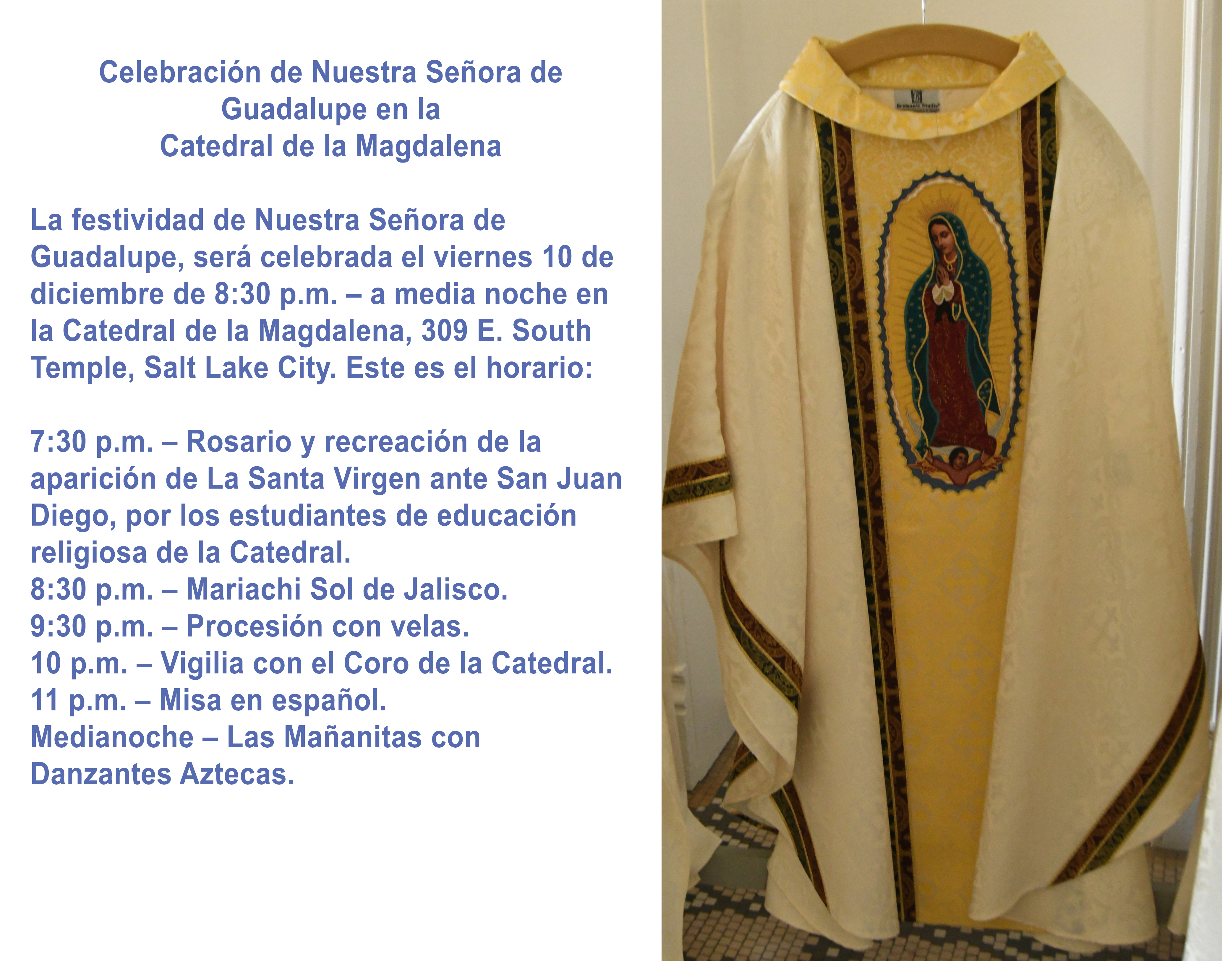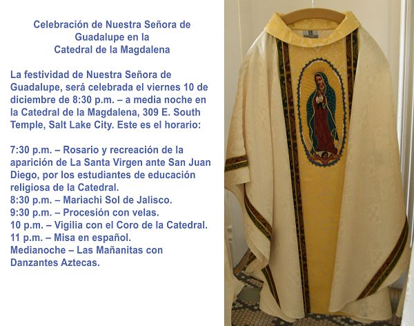 SALT LAKE CITY — La comunidad de la Catedral de la Magdalena en Salt Lake City, como muchas comunidades en Utah, tiene una ferviente devoción a nuestra Señora de Guadalupe. La celebración anual usualmente se realiza el 12 de diciembre. El año pasado miembros de la catedral tuvieron el deseo de adquirir nuevas vestimentas para que el sacerdote las usará específicamente para esta celebración.