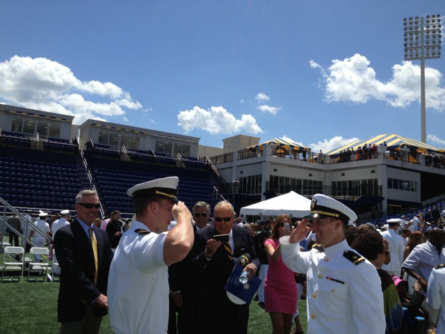 Will Huntsman (left) gives his older brother Jon Huntsman his first salute upon graduating from the Naval Academy in 2013. Both men are Judge Memorial Catholic High School graduates, Class of 2011 and Class of 2009, respectively.Courtesy photo