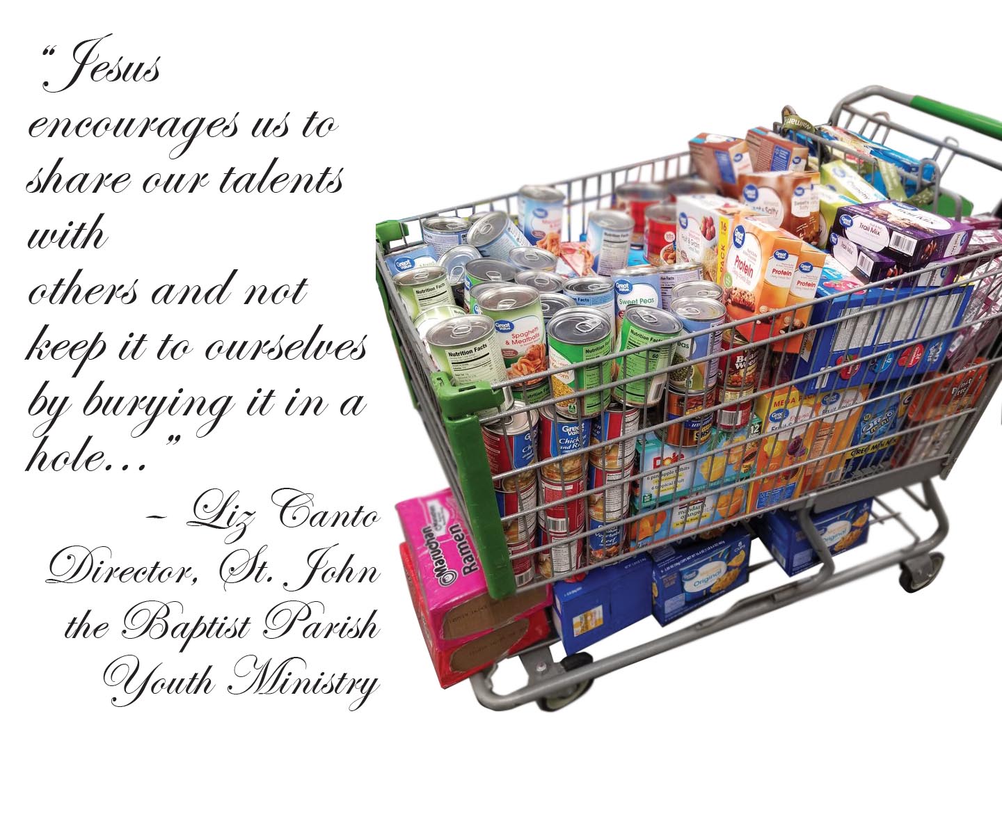 Anyone can contribute to the Cultivating Gratitude Program. Recently, besides the parishioners, students at Saint John the Baptist Elementary School donated cartfuls of food items for the drive.