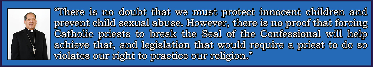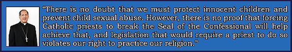 There is no doubt that we must protect innocent children and prevent child sexual abuse. However, there is no proof that forcing Catholic priests to break the Seal of the Confessional will help achieve that, and legislation that would require a priest to do so violates our right to practice our religion.