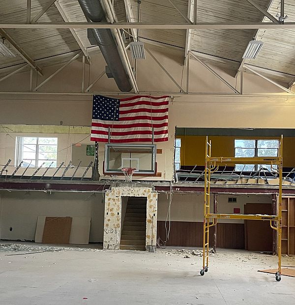 Although the actual footprint of the building will not change, by eliminating some storage space the gym will increase by several feet on its north end, where fixed bleachers will provide seating for 50 to 60 people. The west-end upstairs room, formerly used as the church’s cry room, will be opened up and filled with benches. The area below it will also be used for additional seating. The gym will also get a new floor.